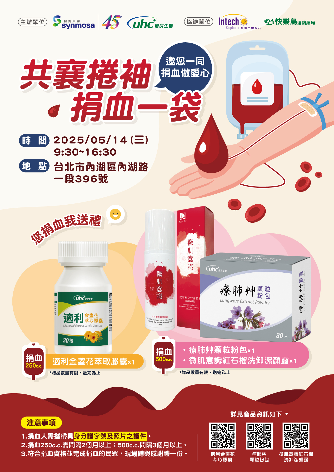 由 健喬 Synmosa、優良生醫 uhc 主辦,益得 Intech 與 快樂鳥連鎖藥局 協辦的捐血活動,近日圓滿完成!